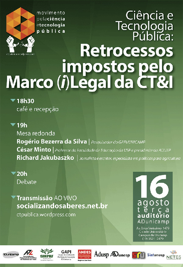 O evento Ciência e Tecnologia Pública: Retrocessos impostos pelo Marco (i)Legal da CT&I terá como debatedores o pesquisador Rogério Bezerra da Silva, o professor César Minto e o jornalista Richard Jakubaszko. Rogério Silva é doutor em Política Científica e Tecnológica pela Unicamp e membro do GAPI (Grupo de Análise de Políticas de Inovação, do Instituto de Geociências da mesma universidade). César Minto é professor da Faculdade de Educação da USP (Universidade de São Paulo) e presidente da Adusp (Associação dos Docentes da USP). Richard Jakubaszko é jornalista com forte atuação no segmento da agricultura, que mais pode ser impactado pela desvalorização da pesquisa pública.