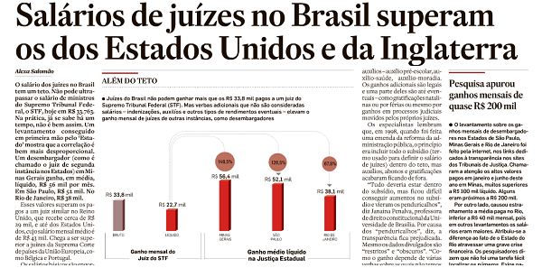 O Estadão publica hoje mais uma das matérias que mostram, outra vez, o absurdo das remunerações milionárias dos juízes e desembargadores brasileiros. Desta vez, para mostrar que ganham tanto ou mais que seus congêneres de países ricos, onde o trabalhador em geral ganha três, quatro, seis ou mais vezes que os brasileiros.
