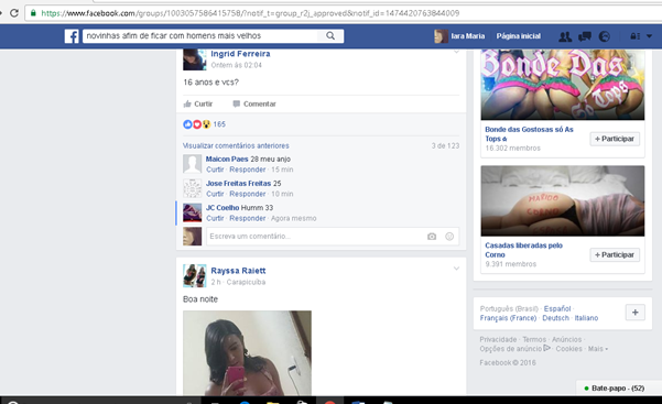 Um caso que enfrentamos atualmente é com a página “ Novinhas afim de ficar com homens mais velhos” que claramente abre brechas que ferem o estatuto da criança e do adolescente violando principalmente as adolescentes. Vários compartilhamentos de nudez entre membros do grupo com idade entre 15 e 50 anos é feito de forma irrestrita.