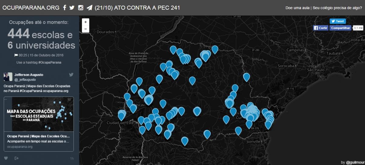 Os estudantes criaram uma plataforma para que a evolução das escolas ocupadas seja acompanha em tempo real. O endereço: http://ocupaparana.org/ (Do GGN)