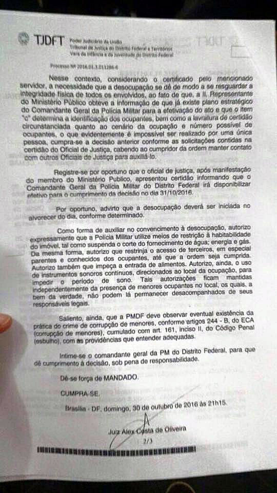O juiz Alex Costa de Oliveira, da Vara da Infância e Juventude do Tribunal de Justiça do Distrito Federal e Territórios (TJDFT), determinou o uso de técnicas de tortura para “restrição à habitabilidade” das escolas, com objetivo de convencer os estudantes a desocupar os locais. Entre as técnicas estão cortes do fornecimento de água, luz e gás das unidades de ensino; restrição ao acesso de familiares e amigos, inclusive que estejam levando alimentos aos estudantes; e até uso de “instrumentos sonoros contínuos, direcionados ao local da ocupação, para impedir o período de sono” dos adolescentes. A decisão é do último domingo (30).