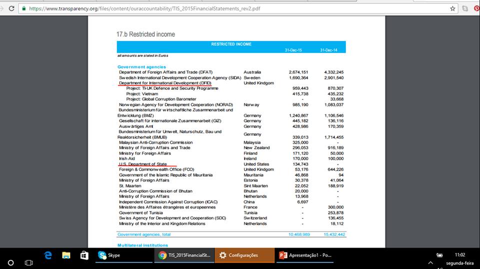 Nanda Java, via Facebook, procurou o Annual Report da tal Ong Transparência Internacional e lá está que a ONG é financiada pelas gigantes do petróleo como Shell e BP, além de alguns grandes especuladores de Wall Street, como George Soros. E também recebe dinheiro do Departamento de Estado dos EUA e da Inglaterra.
