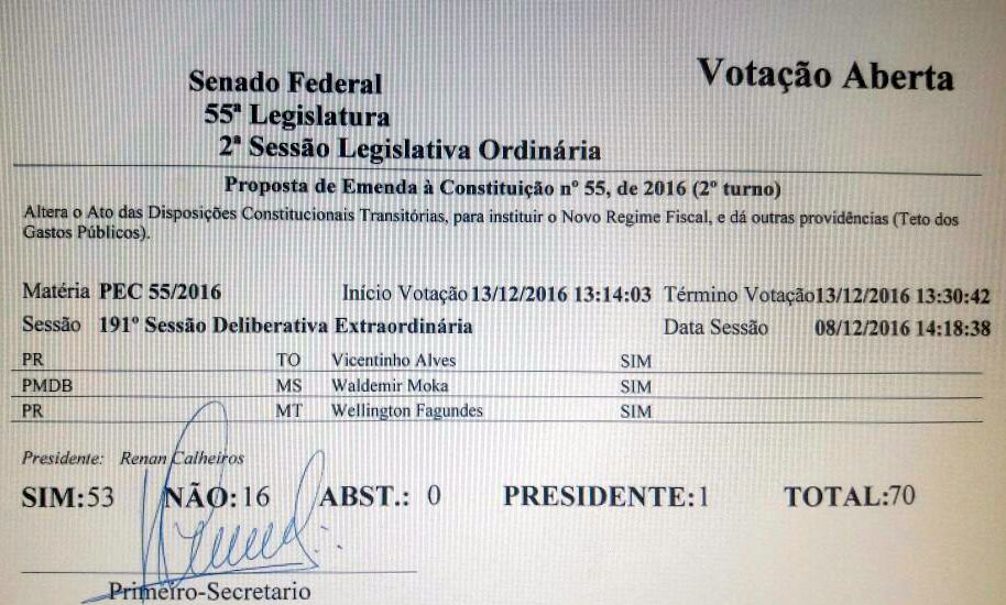Sem Futuro – O plenário do Senado aprovou nesta terça-feira, 13, o texto final da Proposta de Emenda à Constituição 55/2016, que congela os gastos em Saúde e Educação pelos próximos 20 anos.