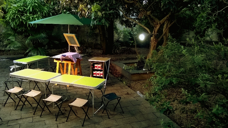 O parque é grande e entramos pela entrada das escadas rolantes. Colado ao parque, há uma casa. Nela estava acontecendo uma festa, até com banda ao vivo. Ao subir umas escadas da entrada do parque, dava para ver as pessoas e a banda no terraço da casa.