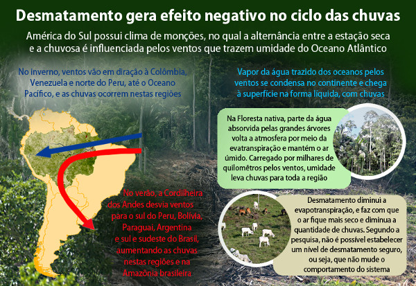 O trabalho enfatizou que o desmatamento gera um efeito negativo no mecanismo de retroalimentação das chuvas. “Normalmente, o vapor de água é trazido dos oceanos pelos ventos. Então no continente ele se condensa e chega à superfície na forma líquida, com as chuvas”, relata o professor do IF. “Essa água é absorvida pelas grandes árvores da Amazônia, e parte volta à atmosfera por meio da evapotranspiração. Isso ajuda a manter o ar úmido, e esta umidade é carregada por milhares de quilômetros pelos ventos, levando as chuvas para toda a região.” (Carta Campinas com informações de divulgação)