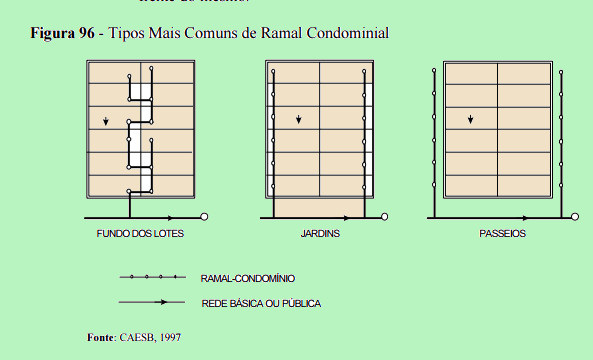 Desse modo, a rede coletora básica ou pública apenas tangencia o quarteirão-condomínio ao invés de circundá-lo como no sistema convencional. As edificações são conectadas a essa rede pública por meio de ligação coletiva ao nível do condomínio (Ramal condominial), cuja localização, manutenção e, às vezes, a execução são acordadas coletivamente, no âmbito de cada condomínio e com o prestador do serviço, a partir de um esquema de divisão de responsabilidade entre a comunidade interessada e o poder público.