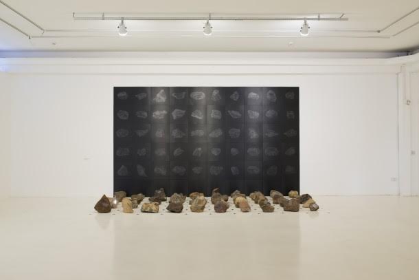 A relação do ser humano com a paisagem é o elemento que percorre por todos os seus trabalhos apresentados. A pedra é outro objeto que está sempre presente, como em Deslocando Territórios, em que o artista apropria-se das pedras localizadas na fronteira do Brasil com o Uruguai e as desenha numa placa de pvc preto colocando em pauta os limites e as fronteiras políticas das quais são inseridas na paisagem geográfica. Afinal, territórios sempre foram uma questão de embate, desde que nós ocidentais, tornamo-nos sedentários.