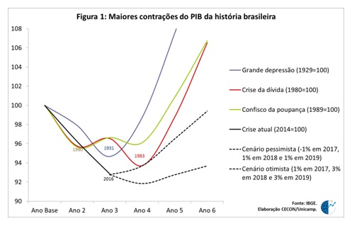 O Brasil está vivendo a maior crise econômica de sua história, segundo estudo realizado pelo Cecon (Centro de Estudos de Conjuntura e Política Econômica da Unicamp) e publicado agora em maio de 2017.