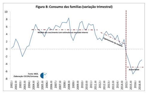 O choque recessivo iniciado ainda no governo Dilma Rousseff (PT), em 2015 (durante a passagem de Joaquim Levy como ministro da Fazenda), lançou mão de um conjunto de políticas de austeridade econômica. “Esse choque recessivo foi composto de: i) um choque fiscal (com a queda das despesas públicas em termos reais), ii) um choque de preços administrados (em especial combustíveis e energia), iii) um choque cambial (com desvalorização de 50% da moeda brasileira em relação ao dólar ao longo de 2015) e iv) um choque monetário, com o aumento da taxas de juros para operações de crédito”, anotam os economistas.
