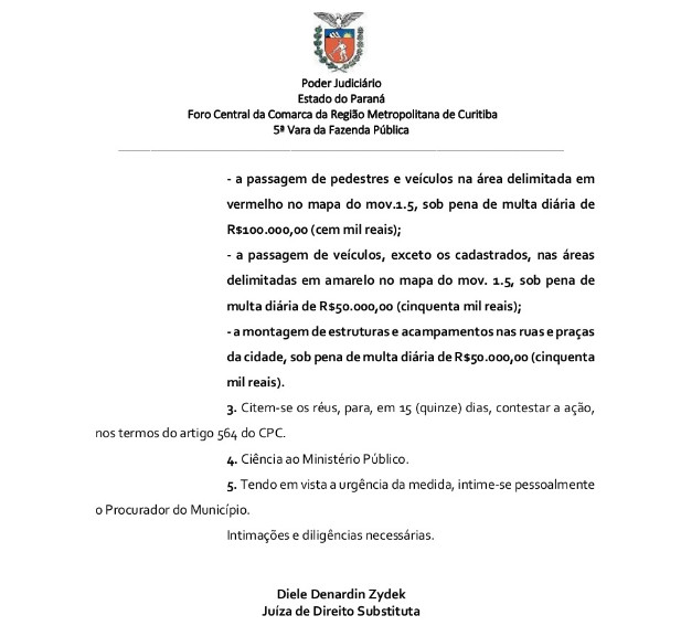 Pela decisão da juíza substituta da 5ª Vara da Fazenda Pública, Diele Denardin Zydek (que apoia Sérgio Moro no Facebook e até tira selfies), haverá um certo das forças de segurança do Estado contra os apoiadores de Lula. A decisão foi tomada a pedido da Secretaria de Segurança Pública do Estado e da Prefeitura de Curitiba. É o chamado Interdito Proibitório (uma área onde ninguém poderá passar). Entre entre 23H00 de segunda-feira e 23H00 de quarta-feira, estarão proibidas na cidade: