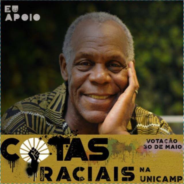 O ator Danny Glover postou na rede social Facebook uma imagem (ao lado) de apoio ao movimento da Unicamp e escreveu: “O livre acesso a uma educação pública de qualidade é um direito social garantido pela Constituição Brasileira. A presença reduzida de estudantes negros e indígenas tornam necessário para haver políticas públicas que legítimo, contra os privilégios e exclusões. Por isso eu apoio quotas na Unicamp, Brasil” (tradução do próprio Facebook)