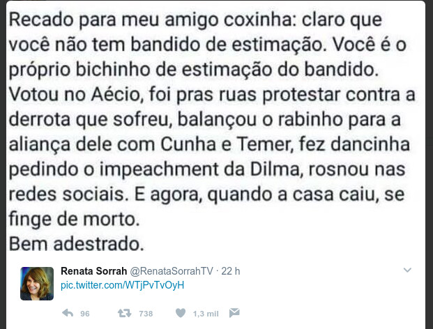 Um twitter atribuído à atriz Renata Sorrah e uma postagem no Facebook no perfil da jornalista Bárbara Gancia explicam o que é ser coxinha no Brasil. No primeiro, o raciocínio coxinha é dissecado para mostrar a realidade pós-queda de Aécio. “Não tenho bandido de estimação”.