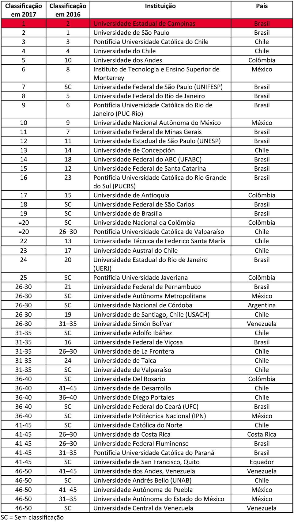 A PUC-Campinas (Pontifícia Universidade Católica de Campinas), por exemplo, não aparece entre as 81 universidades presentes no ranking, assim como qualquer outra universidade particular de Campinas. O ranking foi divulgado nesta quinta-feira (20). Esta é a segunda edição da Times Higher Education Latin America.