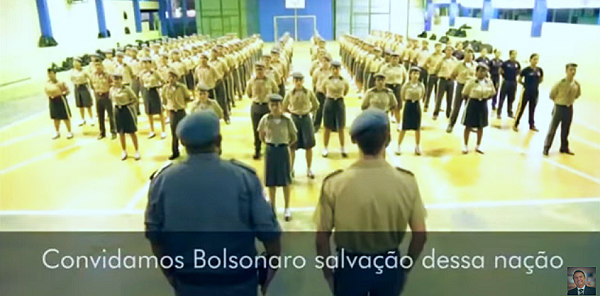 Diante de dois policiais militares, nove filas de alunos do terceiro ano de uma escola estadual em Manaus repetem em coro, com as mãos para trás, o que um dos policiais grita: “Convidamos Bolsonaro, salvação dessa nação/ Nos quatro cantos ouvirão completa nossa canção”. A cena consta de vídeo gravado no Colégio Waldocke Fricke de Lyra, uma das oito escolas administradas pela PM por meio de um acordo com a Secretaria de Educação do Amazonas.