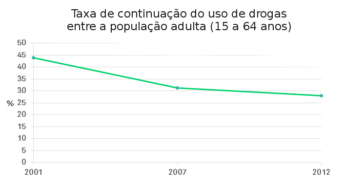 Como este gráfico abaixo mostra, o uso subiu ligeiramente em 2007 (uma tendência comum com outros países similares), mas já recaiu. Há uma tendência de queda, principalmente nos que dizem ter usado droga no último ano ou no último mês. Isso reforça o argumento de que criminalizar as pessoas é uma maneira equivocada e desumana de tentar impedir o uso de drogas.