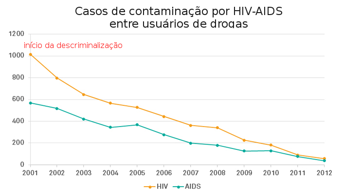 Um outro benefício com a descriminalização das pessoas usuárias de drogas em Portugal está ligada à queda no número de indivíduos contaminados por HIV-AIDS. Houve uma grande queda de pessoas contaminadas após a descriminalização em 2001. Veja gráfico abaixo: