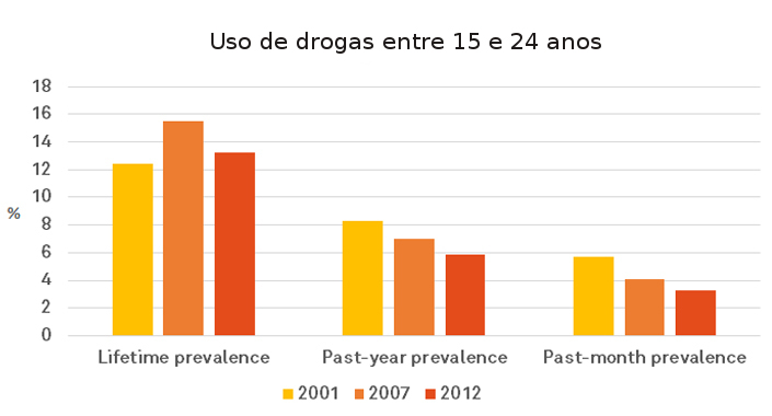 Outro dado importante é a taxa de uso de drogas entre a população adulta (pesquisa entre 15 e 64 anos). Há também uma tendência de queda. Veja gráfico abaixo:
