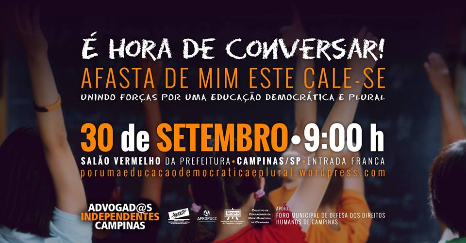 O evento, que acontece às 9h no Salão Vermelho da Prefeitura de Campinas, será um ato contra as tentativas de censurar o professor em todo o país. De acordo com os organizadores, o evento visa unir forças de vários setores da sociedade em defesa de uma escola democrática e plural e combater o movimento fascista denominado “escola sem partido”.