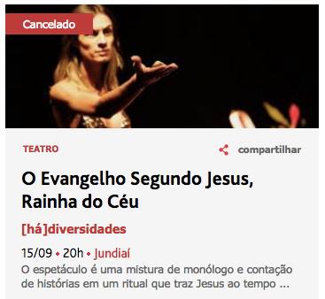 A diretora de teatro Natalia Mallo anunciou no Facebook que o juiz Luiz Antonio de Campos Júnior, da 1ª vara da comarca de Jundiaí, atendendo a um pedido que vem sendo articulado há alguns dias por congregações religiosas, políticos e pelo TFP (Tradição, Família e Propriedade), decidiu cancelar liminarmente o espetáculo O Evangelho Segundo Jesus, Rainha do Céu, que aconteceria nesta sexta-feira, às 20h, no Sesc Jundiaí.