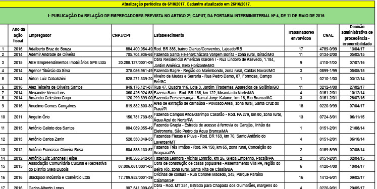 A publicação tem informações sobre 131 empregadores autuados em fiscalizações e detalha dados como o número de trabalhadores flagrados nas condições irregulares, endereço do estabelecimento e a data em que ocorrência foi registrada. A lista tem informações desde 2010.