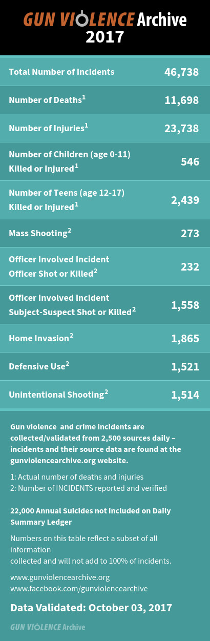 O GVA é uma empresa sem fins lucrativos formada em 2013 para fornecer acesso público gratuito on-line a informações precisas sobre violência relacionada a armas nos Estados Unidos. Neste ano, já foram registrados 11.701 mortes, 23.743 feridos, 547 crianças feridas ou mortas e 2.440 adolescentes mortos ou feridos, sem contar 22 mil casos de suicídio anual.