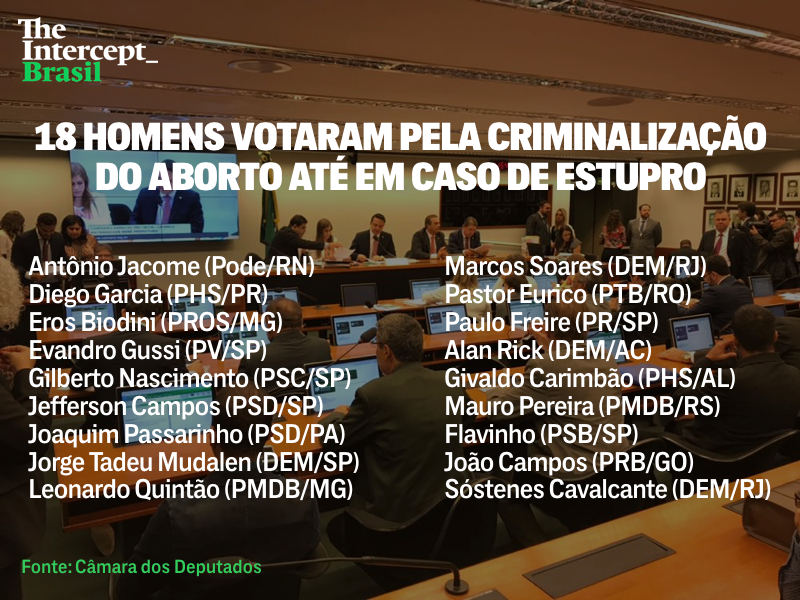 O deputado Glauber Braga (Psol-RJ), por sua vez, questionou a legalidade do funcionamento da comissão, mesmo sem a deliberação, pelo presidente da Câmara, de requerimento de Gussi para prorrogar o prazo dos trabalhos. “Se uma mulher que sofreu um estupro coletivo e realizou interrupção da gravidez, vocês acham que ela deve ser presa?”, questionou. Em resposta, o deputado Sostenes Cavalcante (DEM-RJ) afirmou ser “a favor da vida” e contra “a morte dos indefesos”.