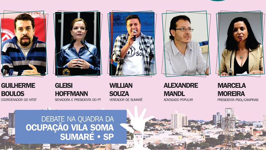 Participam do debate, que acontece na quadra da ocupação, o coordenador nacional do MTST (Movimento dos Trabalhadores Sem-Teto), Guilherme Boulos, a presidenta nacional do PT, senadora Gleisi Hoffmann, a ex-candidata à prefeita de Campinas, Marcela Moreira (PSOL), além do vereador Willian Souza (PT) e do advogado Alexandre T Mandl.