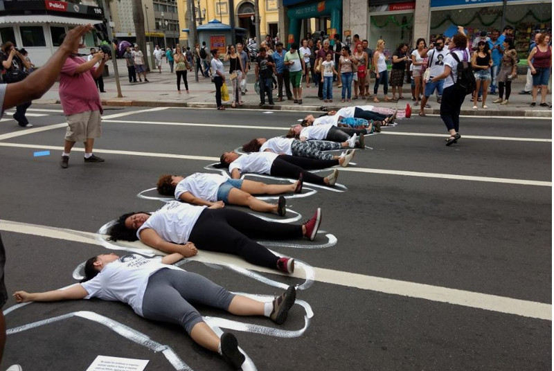 No dia 08 de dezembro, pouco antes de completar uma ano desse múltiplo feminicídio, mulheres da “Minha Campinas” e da Marcha Mundial das Mulheres, portando cartazes, ocuparam a principal avenida de Campinas. Algumas seguraram uma faixa para impedir o trânsito, e 9 se deitaram no asfalto durante 9 minutos em solidariedade às nove mulheres assassinadas, exigindo que os assassinatos fossem reconhecidos como feminicídios. Sete dias após, foram reconhecidos oficialmente como feminicídios. Importante vitória, mas se trata apenas do início de novas conquistas contra o patriarcado. (Foto: Maria de Lourdes Andrade Simões)