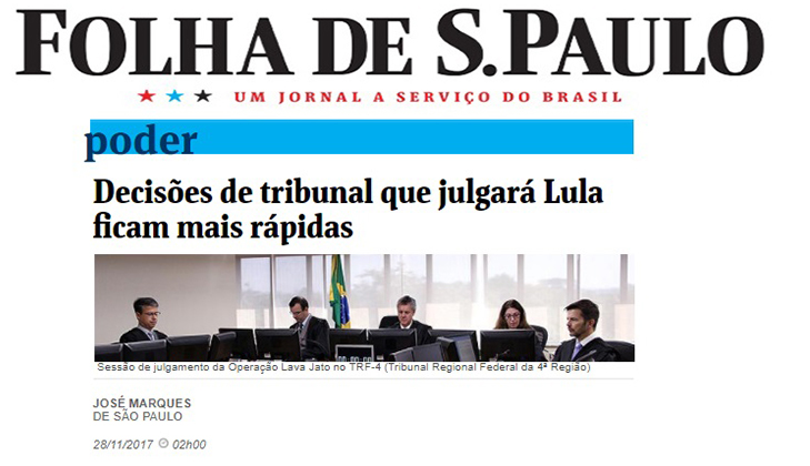 Em 28 de novembro de 2017, a Folha de S. Paulo publicou uma matéria comprovando a montagem do esquema para apressar todos os processos e disfarçar o julgamento de exceção contra Lula. “No total, até agora [novembro de 2017] são 23 ações de mérito já com decisão do TRF-4. Foram 15 apelações julgadas esse ano, contra apenas cinco em 2016 e outras três em 2015. De janeiro a outubro, a média de julgamento das ações foi de 14 meses e meio. Se considerarmos apenas novembro, foi de sete meses”, dizia a reportagem da Folha.