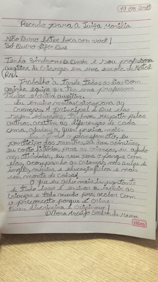 A desembargadora que difamou a vereadora assassinada do Marielle Franco (PSOL) na internet também escreveu o seguinte post sobre a primeira professora com Síndrome de Down do Brasil: