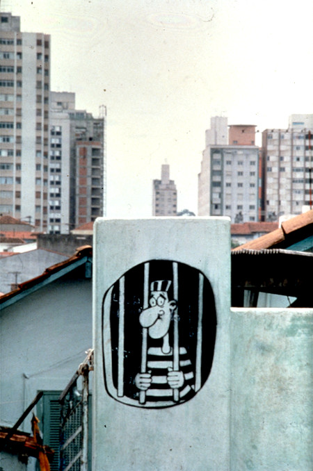 WZ: A diferença do cubo branco é que nele você tem um objeto focado e a pior coisa que pode acontecer é alguém passar na sua frente, atrapalhando a observação do trabalho exposto. Por outro lado, na rua, a melhor coisa que pode acontecer é alguém passar na sua frente, porque existe essa relação da imagem com o ambiente e com a ambiência; o passante se insere na paisagem e, ao inserir-se, passa a pertencer à essa paisagem também. O objeto da galeria é autônomo, e quando estamos na rua nós estamos falando de outra coisa, de um objeto que se relaciona e que se modifica pela interação com fenômenos da cidade. Uma das coisas que eu gostava de fazer era a figura de um preso pintada nos muros. O interessante não era o desenho mas o lugar onde eu o pintava (prendia). Havia muitas casas antigas que tinham porão com umas janelinhas ao rés da calçada: eu adorava pintar o preso entre elas. “Prendia” também nas escolas, nos muros das cadeias, “prendia” em vários lugares que modificavam o significado da imagem.
