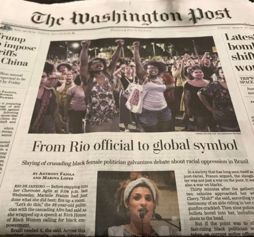 Para Washington Post, Marielle Franco se torna depois de sua brutal execução. um símbolo global na luta contra a violência e a discriminação racial. A reportagem de primeira página do tradicional jornal norte-americano destaca ainda o verdadeiro genocídio praticado nas periferias das grandes cidades brasileiras contra a população negra e pobre.(Do Facebook de Florestan Fernandes Júnior)