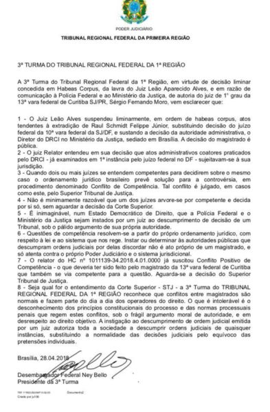 Após Leão deferir o habeas corpus, Moro argumentou que a autoridade pelo caso era do TRF4, a segunda instância de sua vara federal, e não do TRF1, que abrange estados do Norte e Centro-Oeste, além de Minas Gerais.