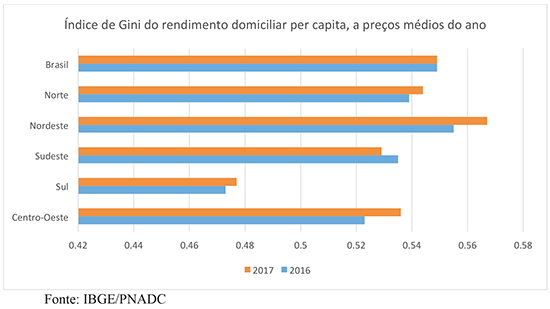 Na decomposição regional, fica mais claro que a queda do rendimento e da renda foi puxada pela região Sudeste. Também foi o Sudeste a região responsável pela estabilidade do coeficiente de Gini, que usualmente mede a desigualdade: em todas as regiões o Gini aumentou (indicando um aumento da desigualdade), enquanto no Sudeste ele caiu pela perda de renda também dos mais ricos. O índice ficou estável de 2016 para 2017, em 0,549.