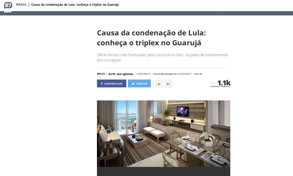 O portal R7, da Record, por exemplo, publicou fotos falsas de um luxuoso apartamento em julho do ano passado, indicando que aquelas fotos seriam o triplex do Guarujá. Até a publicação deste texto, o link da matéria falsa do R7 ainda estava no ar. O Portal R7 tirou a notícia do ar, mas pode ser vista em cache.