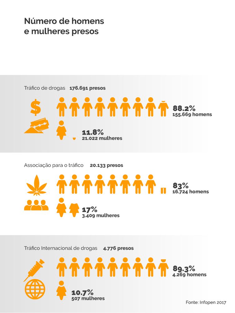 O número de prisões relacionadas às drogas corresponde a 28% das incidências penais pelas quais as pessoas privadas de liberdade foram condenadas ou aguardavam julgamento naquele ano. Entre os homens, esse percentual atingia 26% dos registros, enquanto, entre as mulheres, chegava a 62%. Em 2005, o índice de pessoas apenadas por crimes relacionados ao tráfico era de 14%, sendo 13% para os homens e 49% para as mulheres.