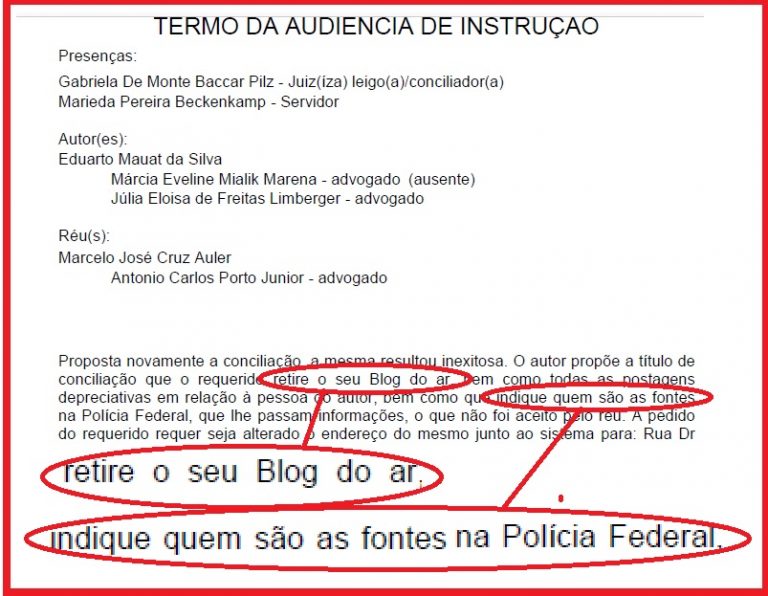 Bem mais pretensioso, ele reivindica o fechamento deste Blog e a identificação das fontes que nos alimentam com informações – verídicas, ressalte-se – sobre os bastidores da Operação Lava Jato. Isto foi verbalizado pelo próprio, no início da noite de terça-feira, no Juizado de Santa Cruz do Sul, cidade distante 150 quilômetros de Porto Alegre. Tal como fizemos constar da Ata de Audiência, cujo trecho reproduzimos ao lado.