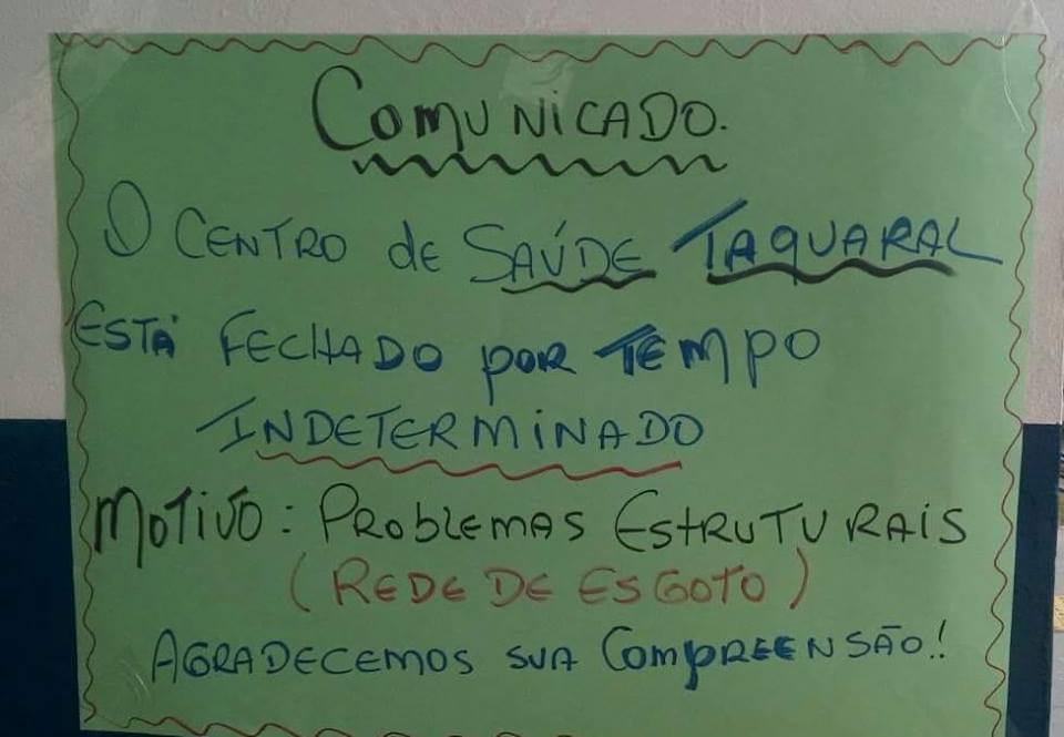 O CS Taquaral passou mais de um ano fechado, até que em 2016 sua reforma fosse finalizada, no valor de R$ 500 mil. Segundo o vereador Pedro Tourinho, com três meses, os problemas começaram a aparecer e diversas consultas foram canceladas. “Eis que ontem (12), o caos se repete. A unidade estará fechada, por tempo indeterminado, porque o esgoto está vazando nas salas de atendimento. Qual a explicação para isso? Quais pedidas serão tomadas? Por quanto tempo a população será prejudicada? São questões que o governo Jonas precisa responder”, anotou o vereador.