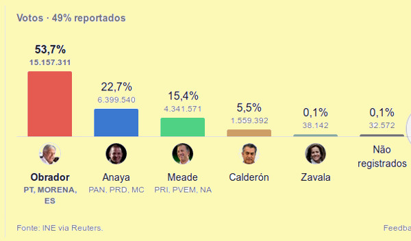 Esta é a terceira vez que AMLO se candidata à Presidência – mas nesta, além de ganhar, obteve votação histórica. José Antonio Meade, candidato do PRI, foi o primeiro a admitir a vitória, poucas horas após o fechamento das urnas. Os resultados de boca de urna davam a ele cerca de 16%, Ricardo Anaya, do PAN, tinha cerca de 22% – menos da metade de Lopez Obrador.