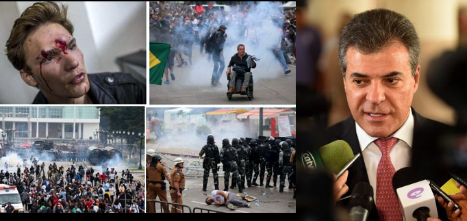 O governador tucano autorizou o uso de força policial em uma operação de guerra que deixou 200 professores feridos durante protesto em Curitiba. Cerca de 1.600 soldados da Polícia Militar do Estado dispararam 2.323 balas de borracha e 1.413 bombas de efeito moral contra professores e servidores públicos do Paraná.