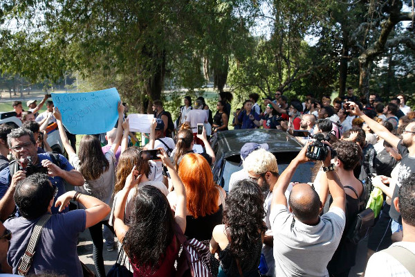 O protesto continuou do lado de fora do portão e houve momentos em que os manifestantes tentaram entrar, quando os portões tinham de ser abertos para a passagem de veículos. Em ao menos um desses momentos, houve uso de spray de pimenta, e o clima ficou tenso.