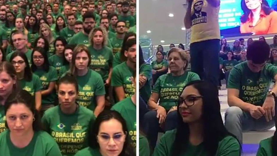 Uma das imagens mais estarrecedoras desta eleição! Luciano Hang, dono das Lojas Havan constrange os funcionários, todos vestidos com camisas pro-Bolsonaro durante uma fala que viralizou na internet e na mídia. O dono das lojas Havan (Loja de Departamento me informei) faz ameaças de desemprego e anuncia o apocalipse caso seus empregados não votem em Bolsonaro.