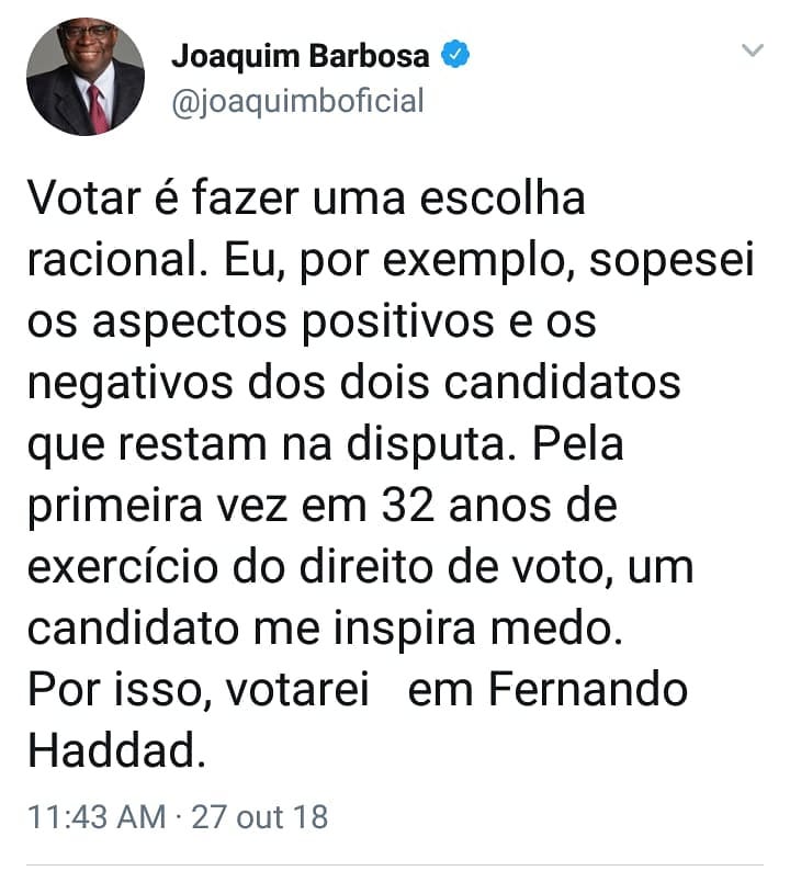 “Votar é fazer uma escolha racional. Eu, por exemplo, sopesei os aspectos positivos e os negativos dos dois candidatos que restam na disputa. Pela primeira vez em 32 anos de exercício do direito de voto, um candidato me inspira medo. Por isso, votarei em Fernando Haddad”, escreveu Barbosa no Twitter.