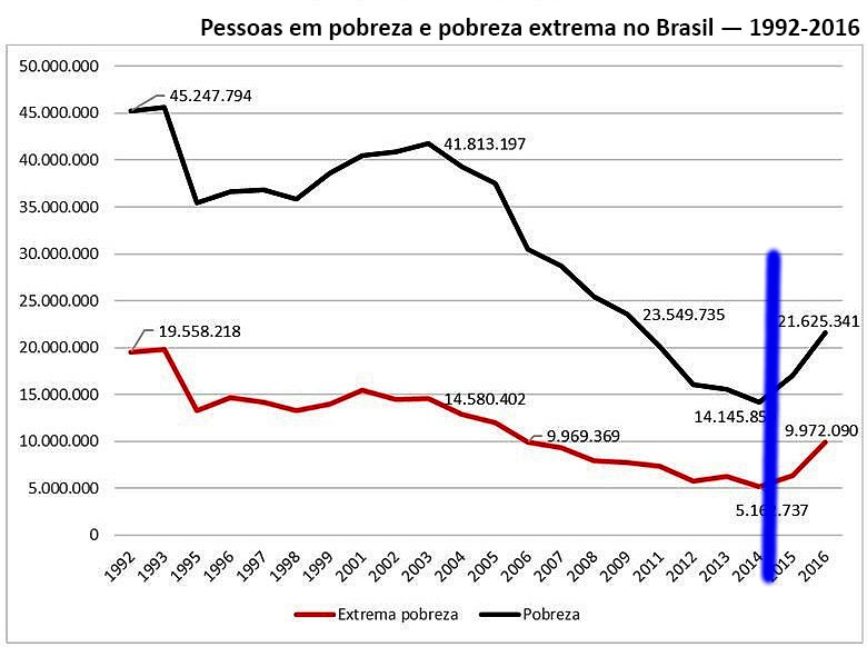 Mas a miséria voltou a subir rapidamente a partir de 2015, ano do início da articulação do golpe parlamentar que retirou Dilma do poder. Em 1992, havia quase 65 milhões de pessoas consideradas pobres no país, sendo 19,5 milhões extremamente pobres – com renda mensal inferior a R$ 70. Em 2014, o número foi reduzido para 19,2 milhões de pessoas na pobreza, sendo 5,1 milhões na extrema pobreza. O dado mais recente, de 2016, indica que já são 31,5 milhões de pessoas nessa situação. (RBA e Carta Campinas)